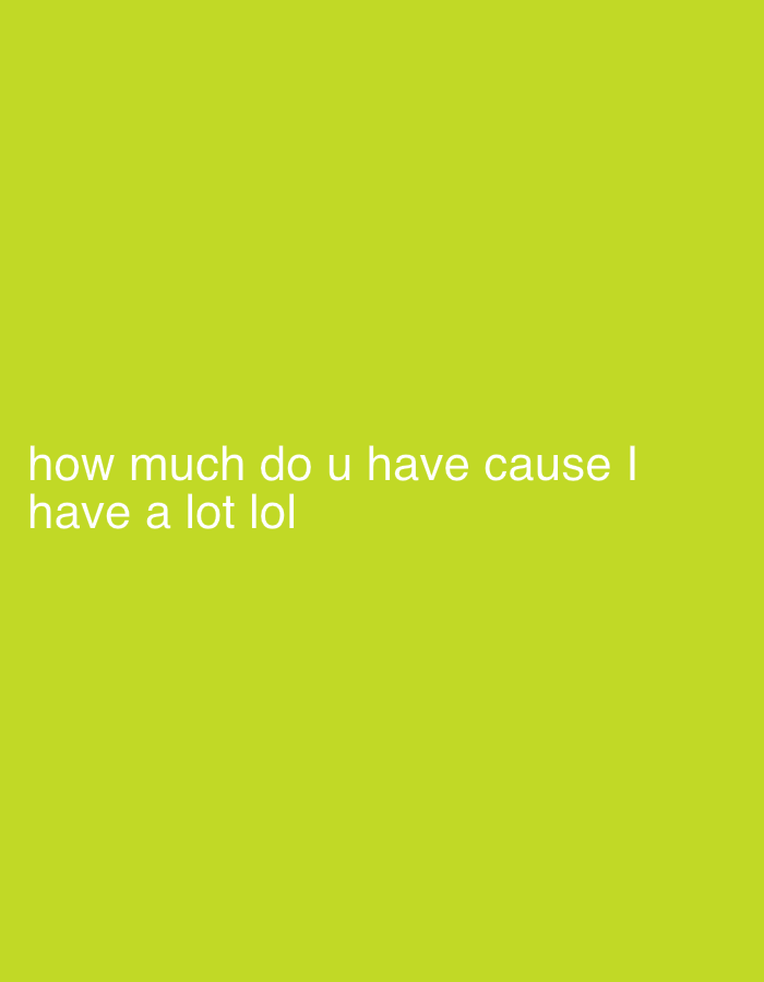 A chartreuse background features the text "how much do u have cause I have a lot lol" in white
