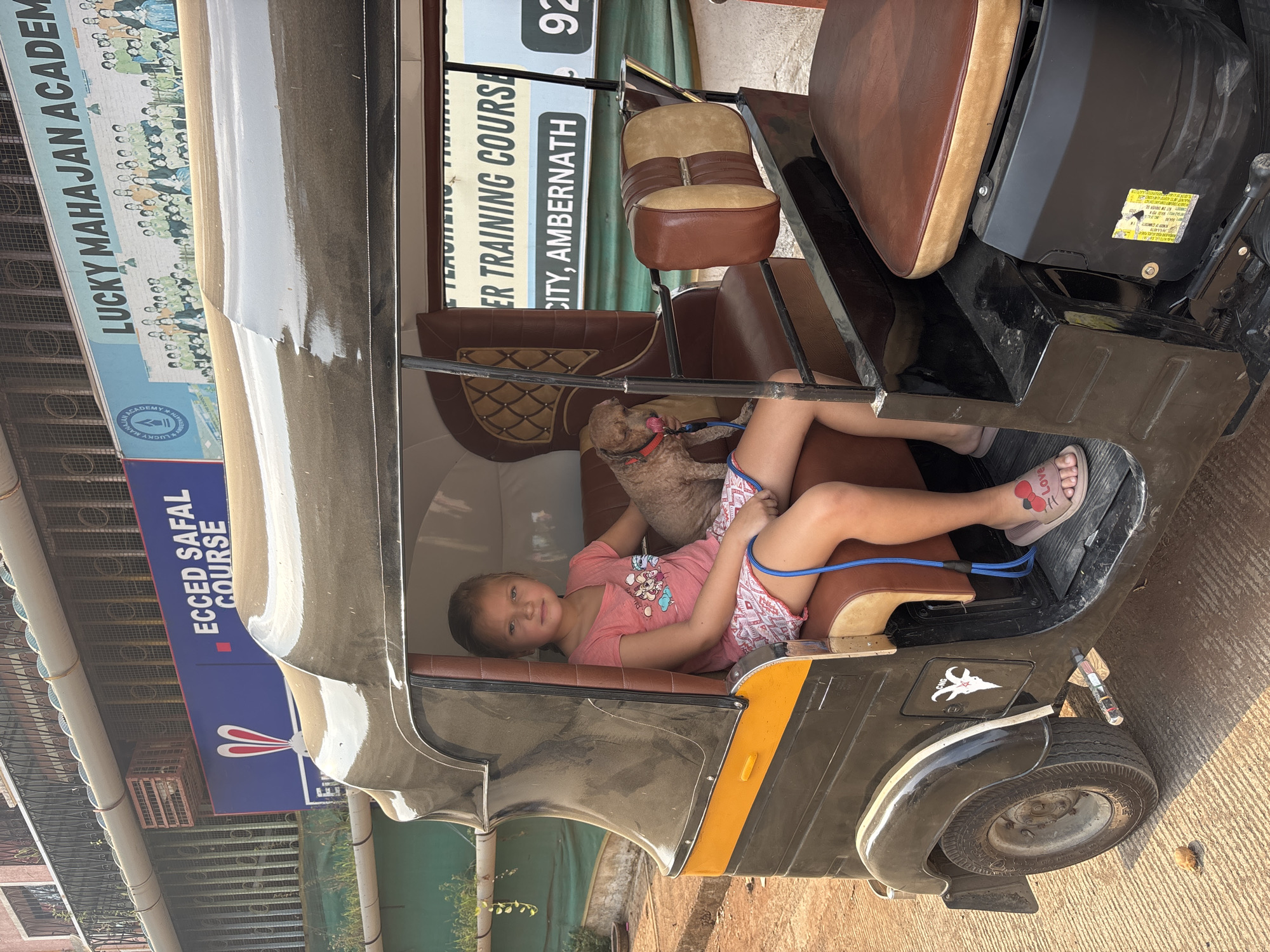 A young girl and a small, light brown dog are seated in the passenger compartment of a black and yellow auto-rickshaw on a paved surface in Ambernath, India