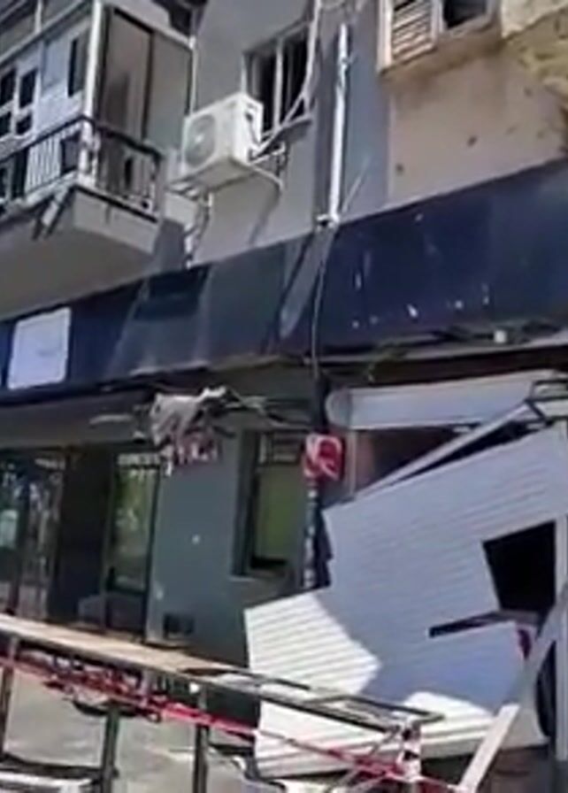 damage to a building, seemingly a store, with a metal roll-down security door severely damaged and bent inwards. The door has multiple puncture holes, suggesting impact damage. The building is light-colored, with a black awning and a balcony with broken glass. Red and white barrier tape stretches across the front of the store. The environment appears to be urban, and the lighting is bright.