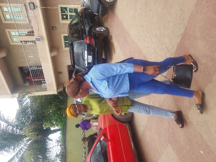 The image portrays an outdoor urban scene in Onitsha, Nigeria. Two women are walking forward, slightly right of center, on a reddish-brown paved surface with an interlocking pattern. The woman on the left wears a yellow headwrap, olive-green long-sleeved shirt, light blue jeans, black platform slides, and glasses; she smiles and holds the left forearm of the second woman. The woman on the right wears a brown patterned headwrap, a blue and white striped long-sleeved button-up shirt, dark blue skinny jeans, and black slides with a gold buckle. She carries a black square handbag with a gold 'T' logo and has a black smartwatch on her left wrist. Both women are looking at each other, suggesting an interaction. In the background, a light brown two-story building features a second-floor balcony with a silver railing, where two figures are partially visible. A small solar panel and an exterior light are mounted on the building's facade. Several vehicles are present: a red sedan is partially visible on the left, a black Toyota Highlander SUV is parked centrally with a Nigerian license plate (partially legible as 'AGL 401 LS'), and a portion of another dark-colored car is seen on the far right. Green foliage, including a large palm tree, is prominent on the left side of the frame, behind a wall. Other individuals are faintly discernible in the deeper background, including one person in a purple top behind the red car.