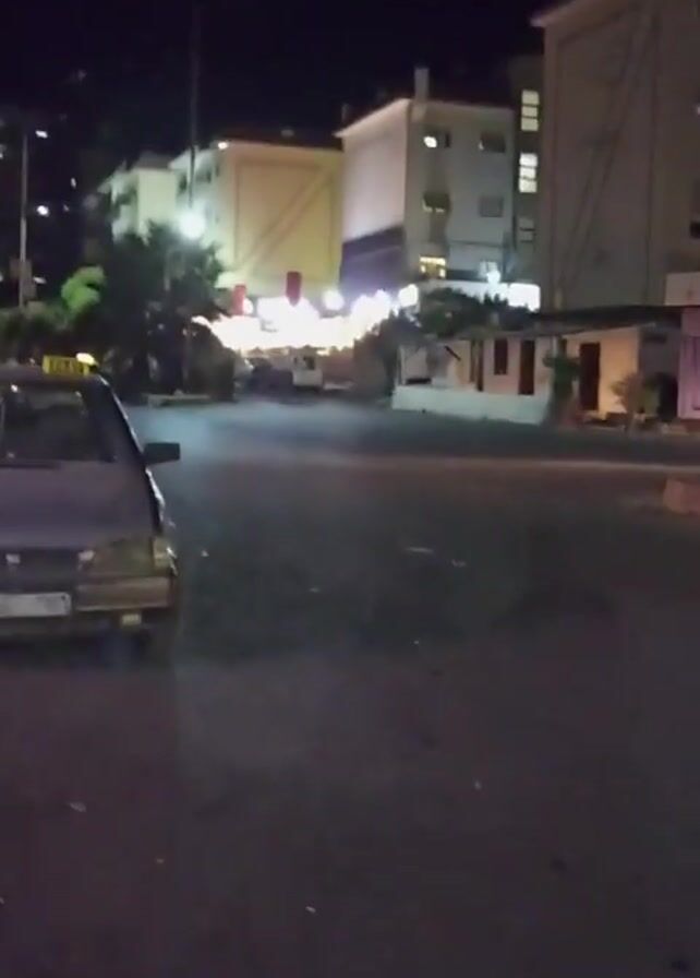 n exterior view of a street at night. A parked taxi with a yellow light on top sits to the left side of the frame. Across the street, illuminated buildings and a business with Arabic lettering in neon are visible. Some people are sitting near the curb in the background. The overall lighting is dim, creating a shadowy atmosphere.