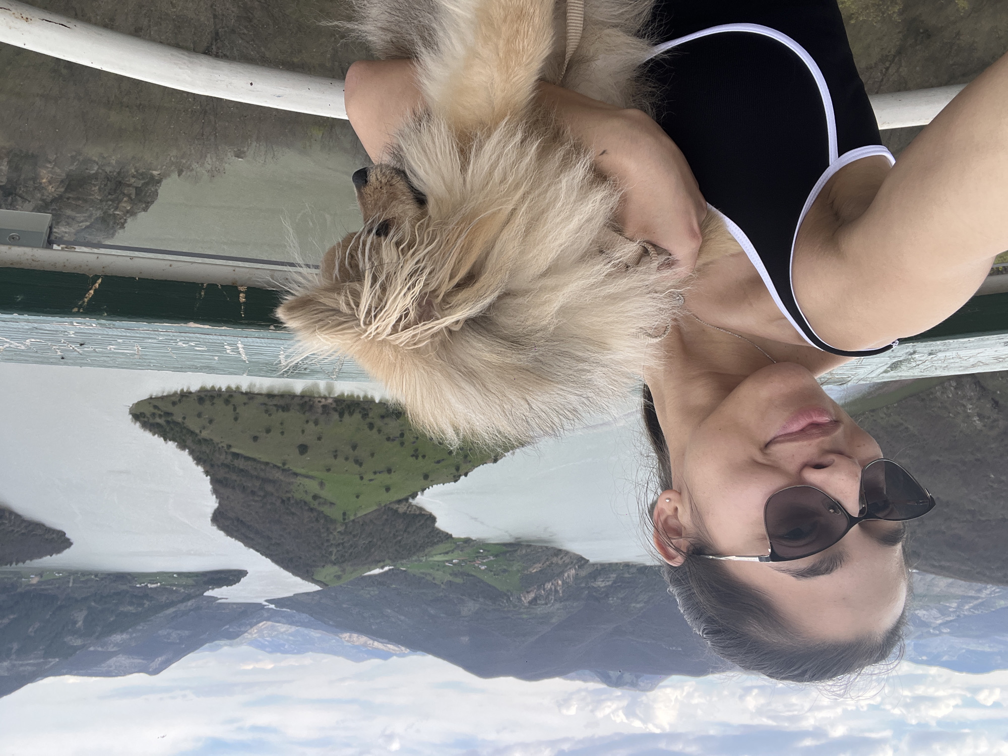 - "A woman wearing sunglasses and a black top with white trim is holding a golden-colored, fluffy dog against a backdrop of a lake and mountains" by FM-KAq9q1, licensed under CC BY 4.0