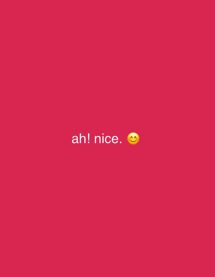 The scene, observed in Erba, Italy, consists of a solid, uniform magenta-red background. Centrally positioned within this background is white, sans-serif text forming the phrase "ah! nice." Immediately to the right of this text is a standard yellow smiling face emoji, depicted with upturned eyes and a closed mouth smile. No individuals, physical objects, or environmental details beyond the colored field and embedded text/emoji are present. No actions or interactions are depicted; the scene is static.