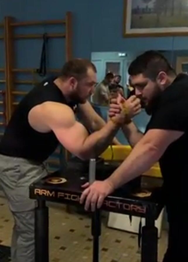 Two men, both with beards and wearing black shirts, are arm wrestling at a table with "ARM FIGHT FACTORY" printed on it