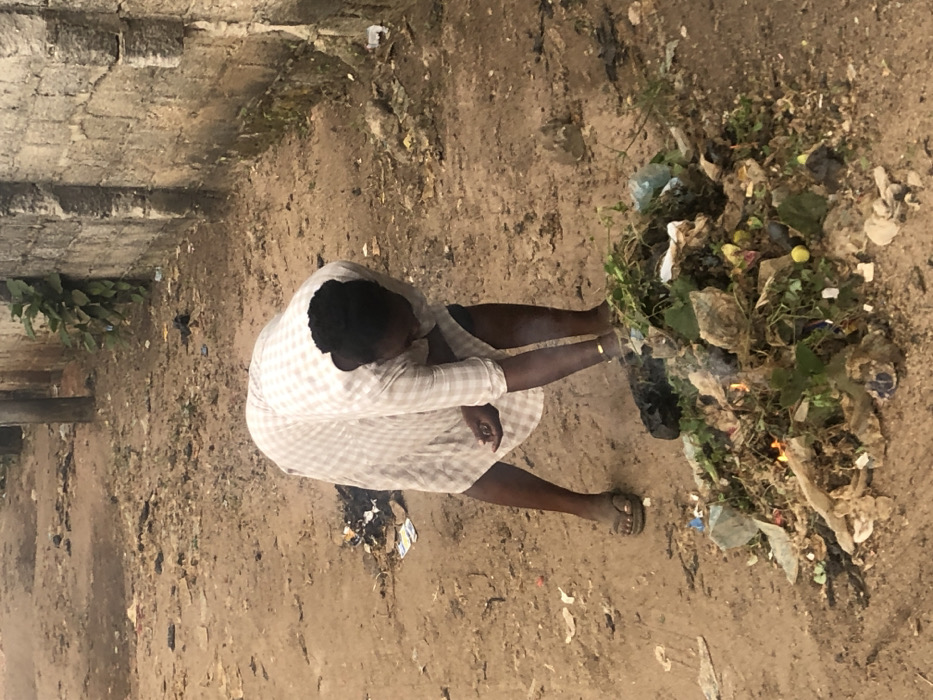 From an overhead perspective, a person in a white checkered dress crouches beside a pile of debris. The debris includes leaves, trash bags, and decaying fruit. Smoke rises from the center of the heap. The person's hands are near the fire. They are wearing flip-flops. A brick wall and dirt ground surround the scene.