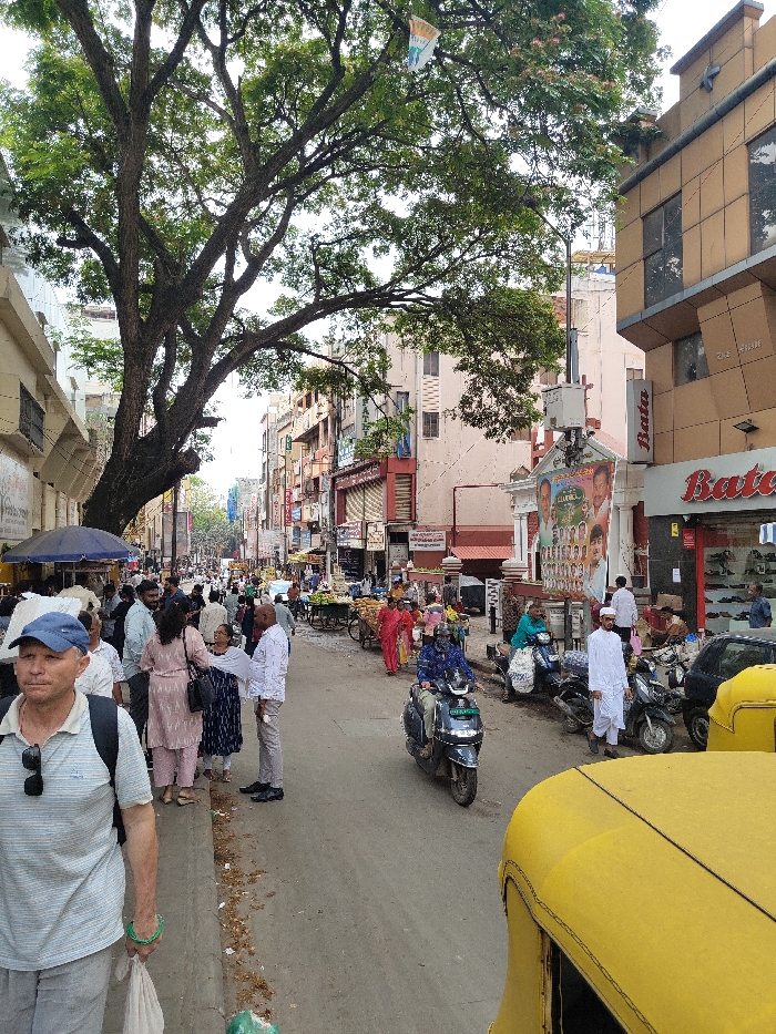 This image depicts a bustling commercial street scene in Bengaluru, India