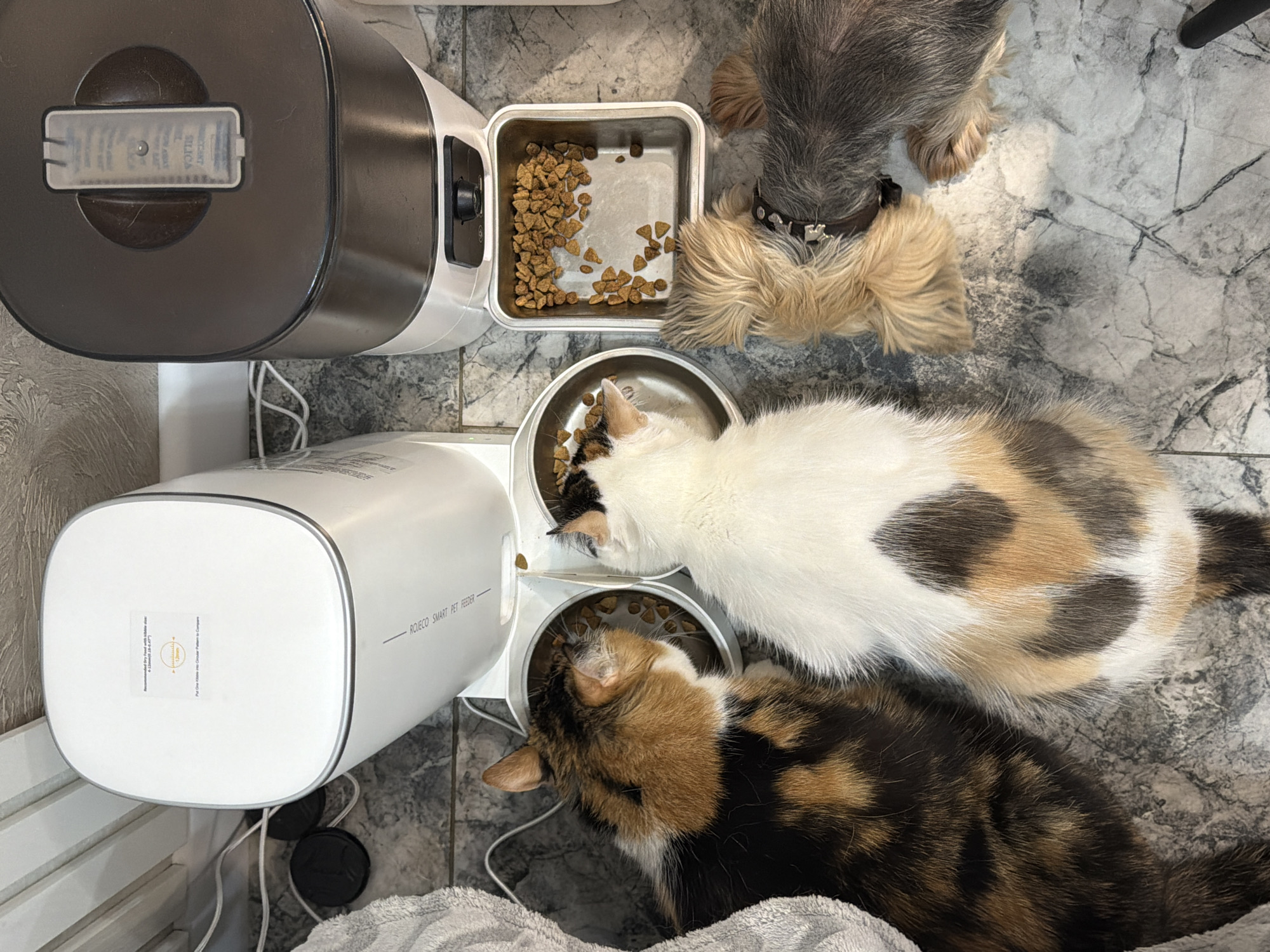 scene with pets feeding from an automatic pet feeder on a tiled floor