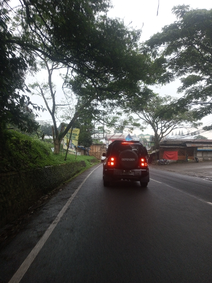 - "The image depicts a dark-colored Land Rover Defender SUV from the rear, traveling on a wet asphalt road under an overcast sky" by FM-neAdm1, licensed under CC BY 4.0