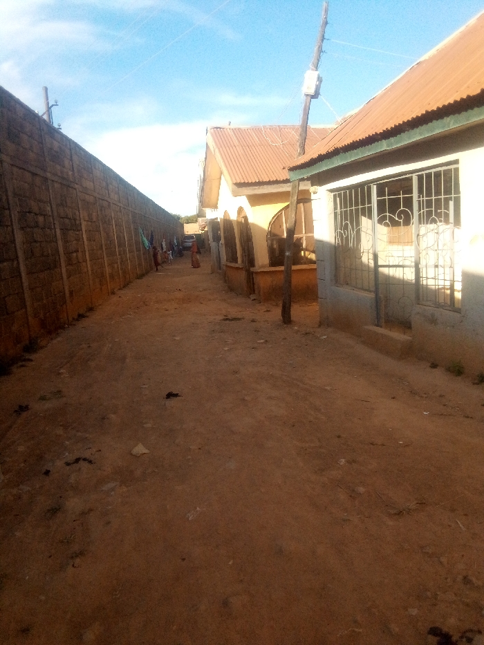 The image depicts an unpaved, reddish-brown dirt pathway or alleyway in Bukuru, Nigeria, under a clear blue sky with minimal cloud cover