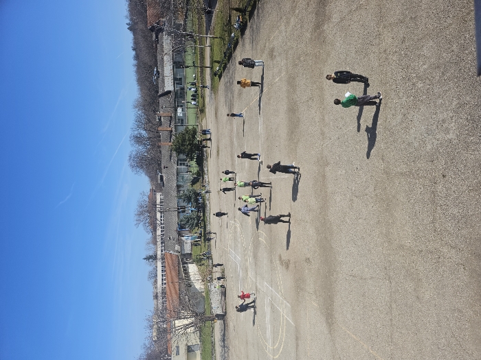 An elevated view captures an outdoor scene on a clear, sunny day in Silistra, Bulgaria. The foreground and mid-ground consist of a large, irregular, unpaved or worn asphalt ground area, light grey in color with visible dirt patches. Faint white lines, consistent with a sports court, are visible on the ground, notably a partial arc and intersecting straight lines in the left-mid section. Approximately 25 individuals, primarily appearing to be children or teenagers, are scattered across this area. Most are standing in small groups or individually. In the immediate foreground, two individuals are positioned on the right; one wears a green long-sleeved shirt and grey pants, holding a white object, facing a second individual in a dark jacket and dark pants. Further back, toward the center, multiple individuals are standing; notable attire includes a bright yellow jacket, a red jacket, and various dark or muted colored coats. Two individuals are seen in the far left mid-ground, one in a red jacket. Most subjects cast distinct long shadows to their right, indicating a sun position to the left. The background features a complex of low-rise buildings. To the left, a light-colored building with an orange-tiled roof is partially visible. Centrally, several older, multi-unit structures with grey roofs are visible, interspersed with bare deciduous trees and some evergreen foliage. A taller, white building is discernible further back on the left. To the far right, a densely wooded, bare-treed hill rises, indicating an elevated natural landscape beyond the urban structures. The sky is clear and bright blue with a few faint contrails.