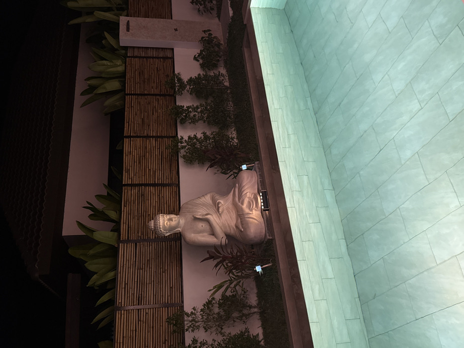 The image depicts an outdoor area at night in Ko Samui, Thailand, centered on a large, light-colored stone Buddha statue seated in meditation (Dhyana Mudra). The statue is illuminated by two white, upward-facing LED spotlights positioned on the ground immediately in front of it and one larger black solar-powered light below its base. It is situated on a raised, dark brown ledge amidst low-lying green and reddish-green foliage against a white wall. Above the white wall is a horizontal bamboo slat fence with dark metal supports, and behind the fence are tall, broad-leafed green plants. Above the foliage and fence, parts of a dark tiled roof and a light-colored building wall are visible against the dark night sky. To the right of the Buddha statue, another taller white structure, possibly an outdoor shower column, stands against the wall. In the foreground, spanning the lower half of the image, is a turquoise-tiled swimming pool, illuminated by underwater lights, creating a soft, blue-green glow on the water's surface and the pool walls. The pool's edge features a dark brown coping similar to the ledge supporting the Buddha statue. No people are visible.