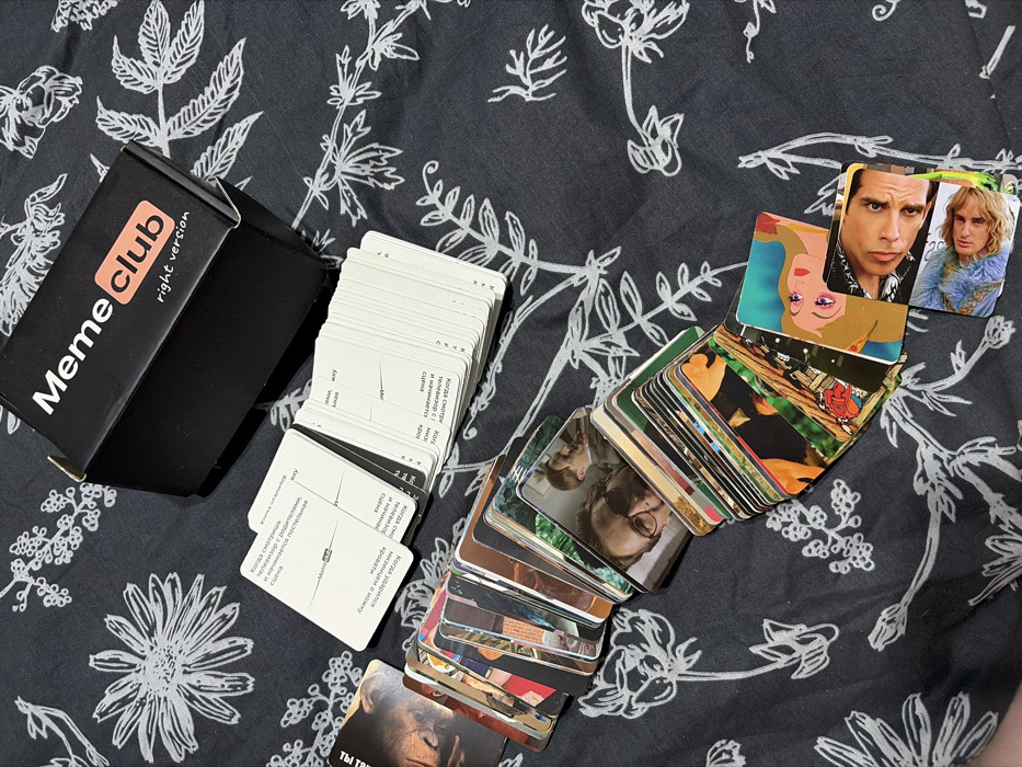 A "Meme Club" game box rests on a patterned fabric next to stacks of cards