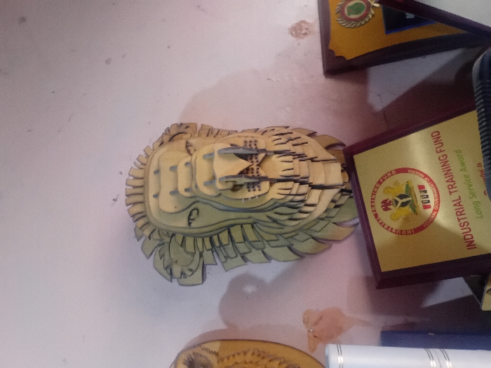 An eye-level, indoor shot displays a layered wooden lion head carving on a cluttered surface. A plaque with the words "INDUSTRIAL TRAINING FUND" is near the lion. Other award plaques, including one with a gold medal, and certificates are also present, obscuring the surface beneath. The light is somewhat dim and the image is slightly rotated.