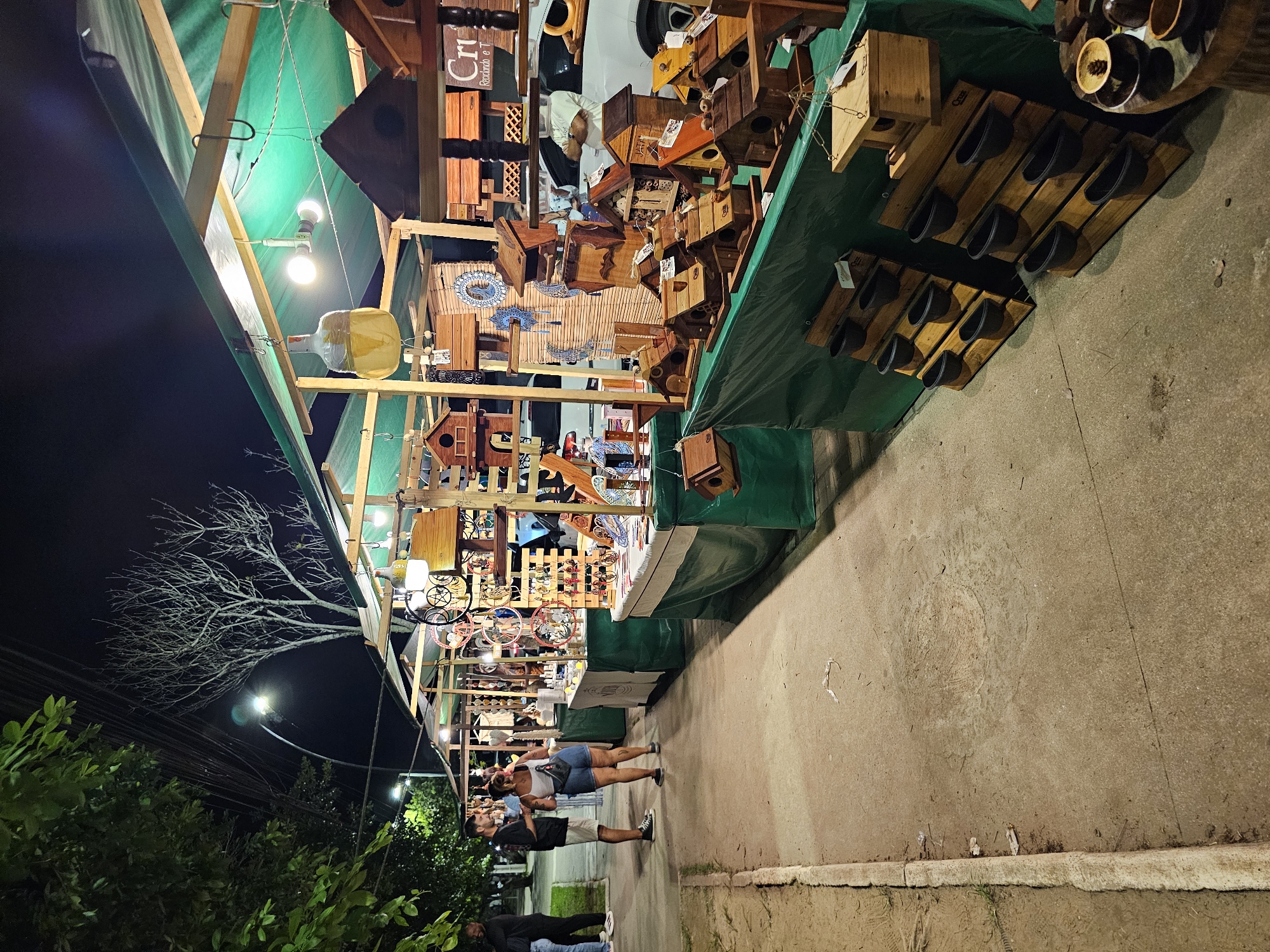An outdoor night market is depicted along a concrete sidewalk in Armação dos Búzios, Brazil. The scene features multiple vendor stalls with green tarpaulin roofs supported by wooden frames, illuminated by artificial lights suspended underneath. The ground consists of a concrete pathway bordered by a dirt strip and curb on the left. In the foreground and mid-ground, several individuals are present. On the left, a male wearing a dark t-shirt and light shorts stands facing a female in a white tank top and denim shorts; both are on the concrete path, appearing to converse or observe. Further left and partially obscured by foliage, other individuals are visible. In the background, behind one of the stalls, a person with arms crossed is partially visible. The stalls display a variety of handcrafted items, predominantly wooden birdhouses of various designs and sizes, some with price tags. Also visible are wooden planters with dark circular pots, decorative elements like dreamcatchers, and a large clear bottle containing a yellowish liquid suspended from a stall beam. Signage with Portuguese text, including "Cri Reciclando e T", is present on some displays. Streetlights illuminate the background, where bare trees and overhead power lines are visible against a dark night sky. A white vehicle is partially discernible behind the stalls in the mid-ground right. Debris, including small pieces of paper and organic matter, is scattered on the concrete path.