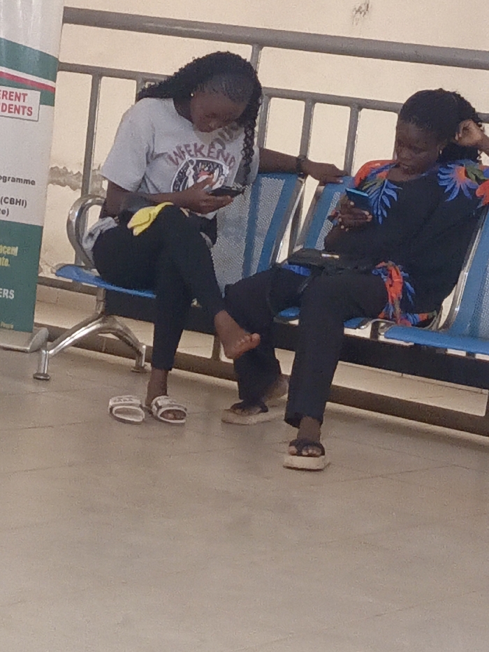 Two young adult females are seated on a public waiting bench with blue plastic seats and metallic frames in an indoor facility, attributed to the city of Ube, Nigeria