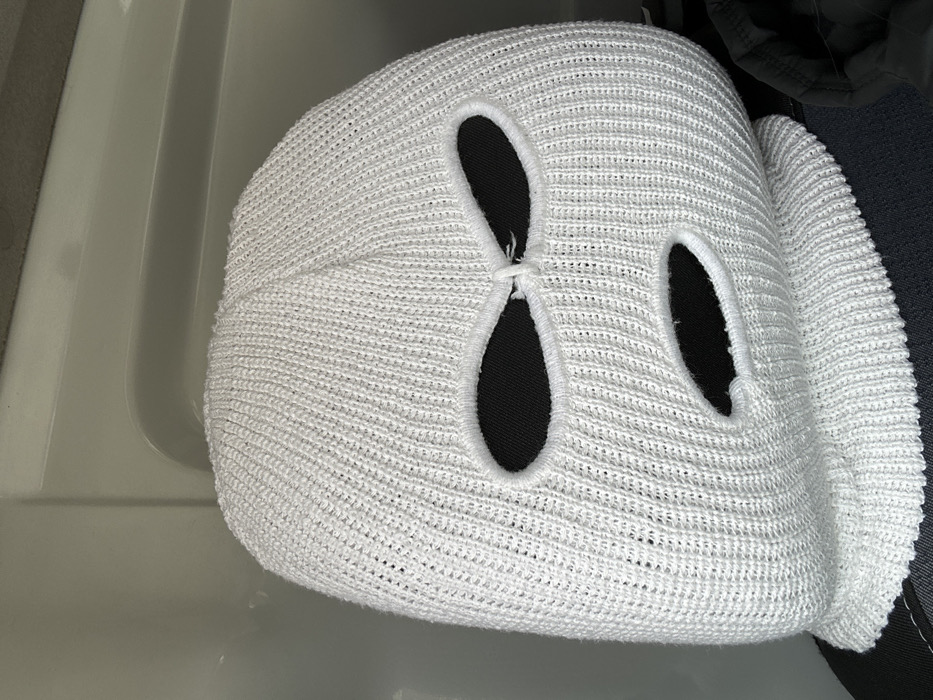 A white, knitted balaclava is centrally depicted, facing forward