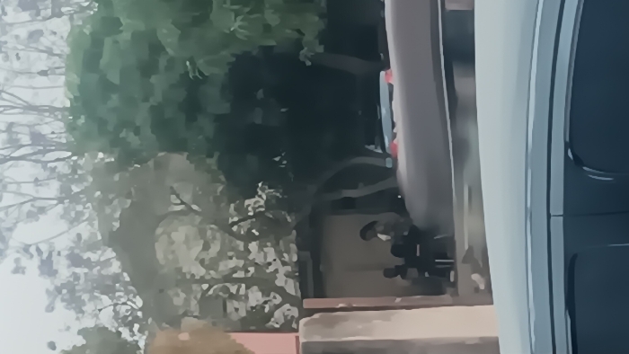 An outdoor scene in Jos, Nigeria, depicts three individuals situated beneath dense foliage and a tree canopy. In the immediate foreground, the upper portion of a light-colored vehicle, likely a car, partially obstructs the view. To the left, a light-colored building or wall is visible. Under the trees, two individuals are seated, facing right. A third individual, appearing to be a woman with long hair wearing a light-colored top, stands facing left, positioned towards the seated figures. An indistinct dark object is visible between the seated and standing figures. Behind the individuals, the rear section of a dark-colored vehicle, possibly a sedan, is present, showing visible red taillights. The background consists predominantly of dense green trees and an overcast sky.