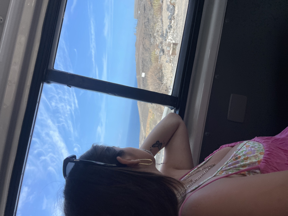 A young woman with long dark hair is sitting in the passenger seat of a vehicle looking out the window. She is wearing a pink sundress with floral print and has a butterfly tattoo on her left arm. She is wearing gold earrings, a necklace, and sunglasses. She is looking out the window at the view of the ocean and the coastline. The sky is blue with some white clouds. The window is open and a black frame surrounds it. She is seated in the front passenger seat of a vehicle, and there is a black panel to her right. This is the view from a vehicle traveling along the coastline near the town of Adeje, Spain.