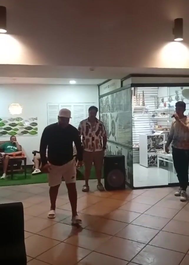 n indoor scene with a man dancing in front of a small group of people. The man dancing is wearing a dark long-sleeve shirt, white shorts, a white baseball cap, and white sandals. He's in the center of the room, moving energetically to music. To his right, another man stands with a microphone, seemingly hosting or singing along. A third man is standing behind the dancer, casually observing. In the background, a couple of people are sitting in chairs on a small artificial turf area. To the right, there's a display case, possibly in a store or lobby, filled with various items like jewelry or souvenirs. A black speaker sits on the floor next to the man behind the dancer. The room has tiled floors and is lit by recessed lighting in the ceiling. There's a dark chair on the left side of the frame, partially obscuring the view.