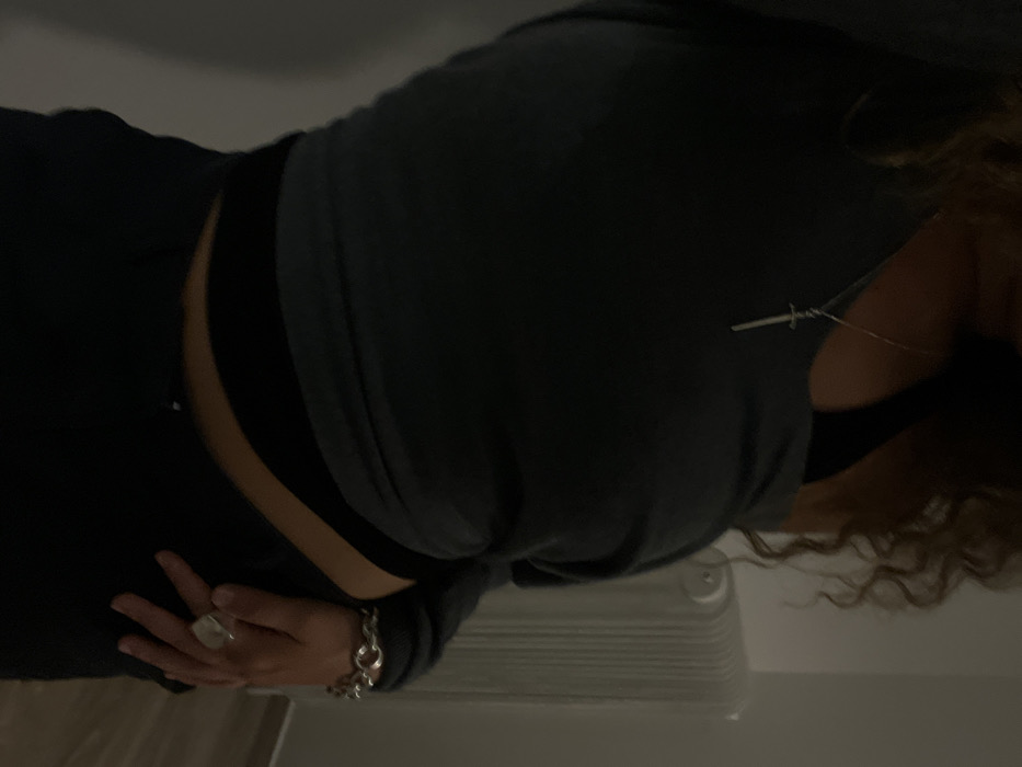 An indoor, vertically oriented image depicts a partial view of an individual from the torso down, captured in dim lighting within an unidentifiable interior space in Athens, Greece. The subject wears a dark gray long-sleeved top, worn off-shoulder on the right, revealing a black undergarment strap and a segment of the abdomen. A silver-colored necklace with a prominent sword-shaped pendant is visible on the chest. The subject's right arm and hand are visible, accessorized with a chunky silver-colored link bracelet on the wrist and a large, light-colored ring on the ring finger. Curly hair is discernible on the right side of the subject's head/neck area. The background features a plain, light-colored wall. A white panel radiator is partially visible on the right side of the frame. The floor in the bottom right corner appears to be light brown wood. No specific landmarks or architectural features are present to pinpoint a precise location within Athens beyond an interior setting.