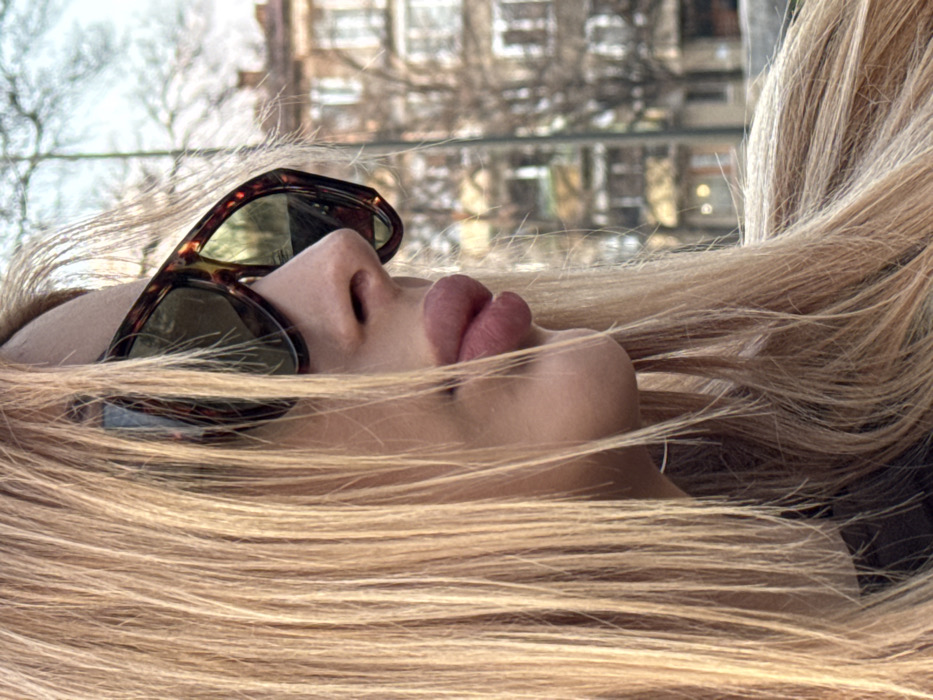This image presents a tight, right-profile view of an individual, appearing female, encompassing the area from the mid-forehead to the chin. The subject wears large, tortoiseshell-patterned sunglasses with dark, possibly reflective lenses, obscuring the eyes. Long, straight, light blonde hair frames the face and cascades over the shoulder. Observable facial features include a defined nose and full lips, which appear to have a light pink or nude tint. The individual is looking towards the left side of the frame. The background is rendered out of focus, indicating a shallow depth of field. The scene is set in an urban environment in Sofia, Bulgaria. The blurred background features several multi-story buildings, characteristic of older residential or mixed-use architecture common in established central or semi-central districts of the city, such as Lozenets or Oborishte. These structures display multiple windows and light-colored facades; a portion of a reddish-brown tiled roof is visible on one building in the upper right. Numerous leafless deciduous trees are interspersed among the buildings, suggesting a park or boulevard setting during late autumn or winter. The sky above is pale. No specific actions or interactions are discernible beyond the subject's contemplative pose.