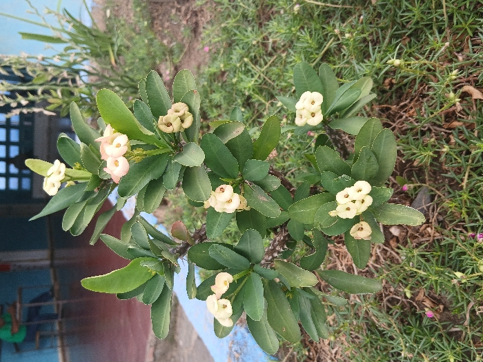 - "The image depicts an outdoor scene in Tinaco, Venezuela, centered on a flowering Crown of Thorns (Euphorbia milii) plant" by FM-pfpsG2, licensed under CC BY 4.0