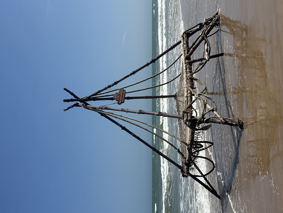 On a sandy beach, a tilted image displays a wooden fishing structure. It consists of several poles converging at a central point and attached to a net-like frame. The structure is partially submerged in the shallow water, with waves gently lapping around it. A small sign with the words "Pandanus Resort" is visible near the center. The sky is a clear blue, and the ocean stretches to the horizon.
