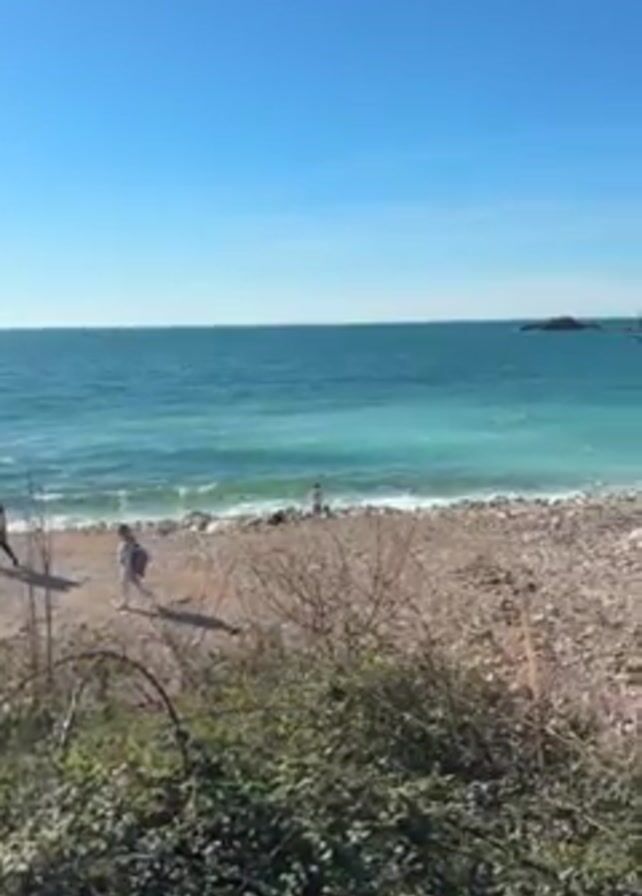 rocky beach under a clear blue sky, with turquoise water meeting the shore in small waves. Several people are walking along the beach. To the right, a steep, green-covered cliff stretches up, partially obscuring the end of the beach. The foreground is filled with low vegetation, slightly blurring the view of the beach. The camera slowly pans right, revealing more of the cliffside and the curve of the beach.
