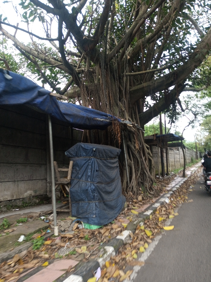 This image captures a roadside scene in Khajuripada, India, under an overcast sky. On the left, a large tree, possibly a banyan, features a dense canopy and numerous prominent aerial roots descending towards the ground. A dark blue tarp serves as a makeshift awning, extending from the tree towards a light grey concrete wall. This awning is supported by at least one metallic pole. Beneath the tarp, positioned against the wall, is a wooden chair with a light-colored frame. Adjacent to the chair, a rectangular object is completely enveloped in a dark blue tarp, secured with ropes around its circumference. The immediate ground area under the tarp and along the wall shows sparse vegetation and some scattered debris. To the right, a sidewalk curb, painted with alternating black and white segments, runs parallel to an asphalt road. The sidewalk and road edge are heavily covered with dry, fallen yellow and brown leaves. In the midground on the asphalt road, a person wearing a dark shirt is observed operating a motorcycle, moving away from the viewer. Further down the road, additional concrete walls and green foliage are visible along the roadside.