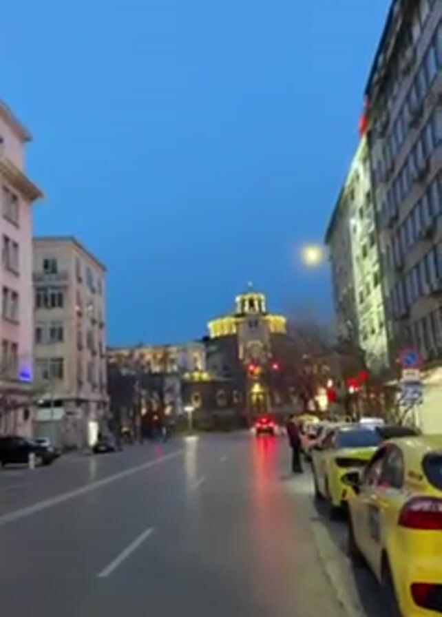 The camera is held stationary at street level, capturing a view along a city street at twilight