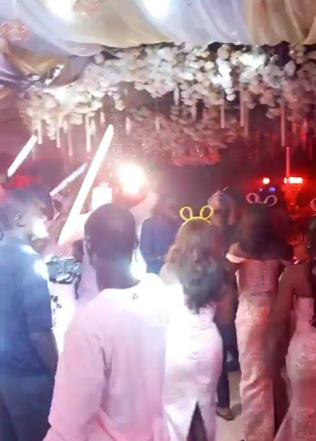 The video captures the vibrant atmosphere of a wedding reception. Guests, some in formal attire like long dresses, are seen dancing and moving around on a floor lit by red lights and bright spotlights. Decorations include a ceiling draped with white fabric and embellished with hanging floral arrangements. Some attendees are seen waving light sticks in the air, contributing to the celebratory mood. A gold humanoid figure is also visible.