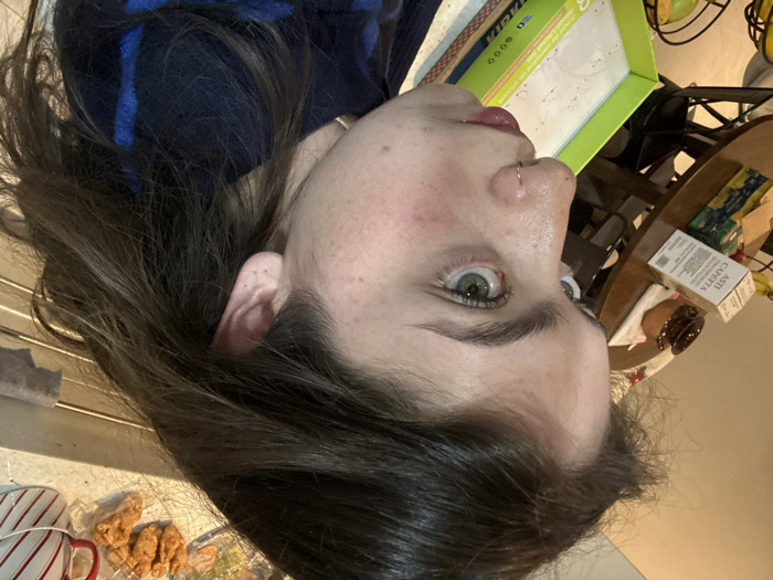 A woman with dark hair and green eyes poses, her head tilted. She wears a blue and black striped shirt. A small nose ring is visible. The background includes a table with various items, including a box of Asti Capetta, a green box, and some snacks. The table surface features a patterned tablecloth. Part of a kitchen counter with a Christmas-themed mug and food items is also in view.