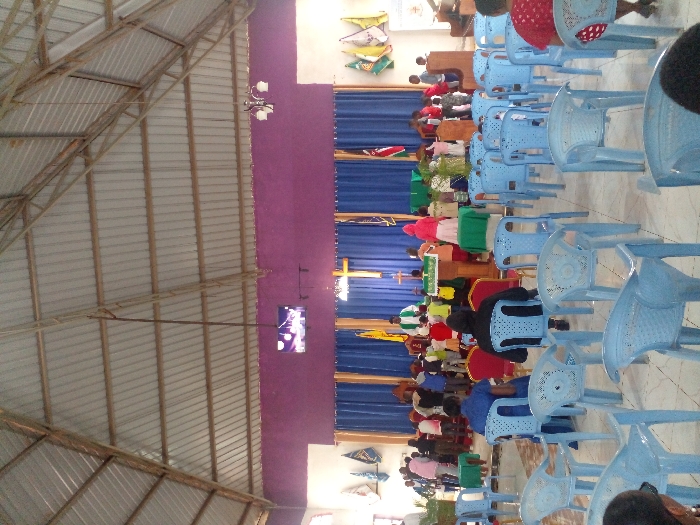 An indoor scene shows a church service in progress, with rows of light blue plastic chairs filled with people