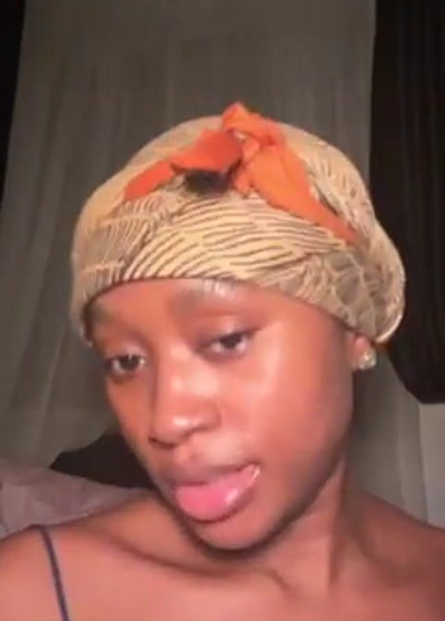 . A young woman is recording herself in a dimly lit space. She is wearing a dark blue camisole and a head scarf with a brown and orange pattern. Her skin is visibly dewy, and she has dark red nail polish on her fingernails. She looks directly at the camera, speaking and gesturing with her hands towards her chest and neck. Behind her, there are curtains and what seems to be the edge of a bed.