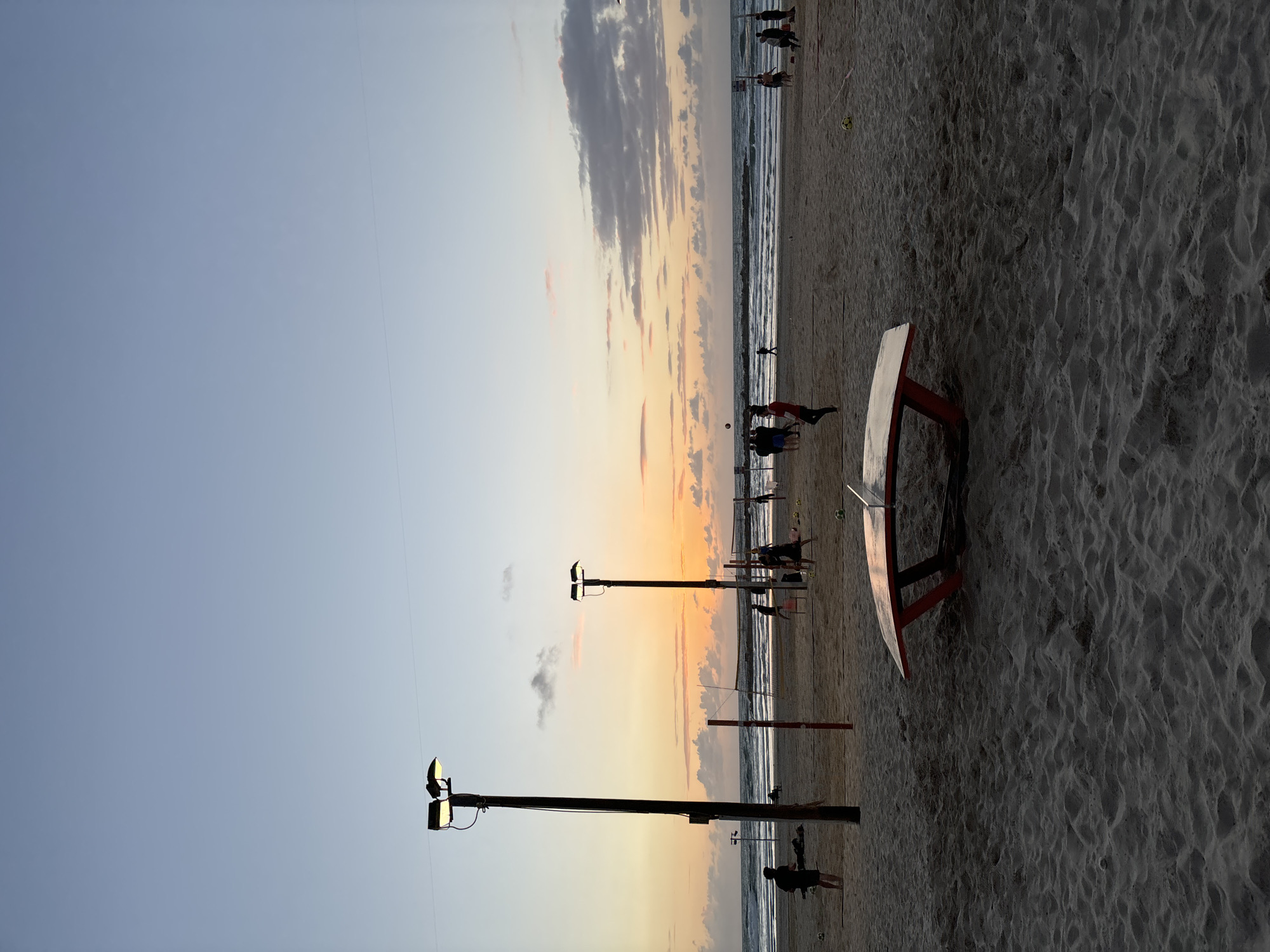 beach scene at sunset in Tel Aviv, Israel. Several people are engaged in activities on the beach near the water. In the foreground, there is a picnic table on the sand. There are streetlights along the beach. The sky is a mix of blue and orange hues from the setting sun, with clouds visible. The horizon line where the sky meets the sea is clear. The sand appears dark and slightly wet. There are volleyball nets further down the beach.
