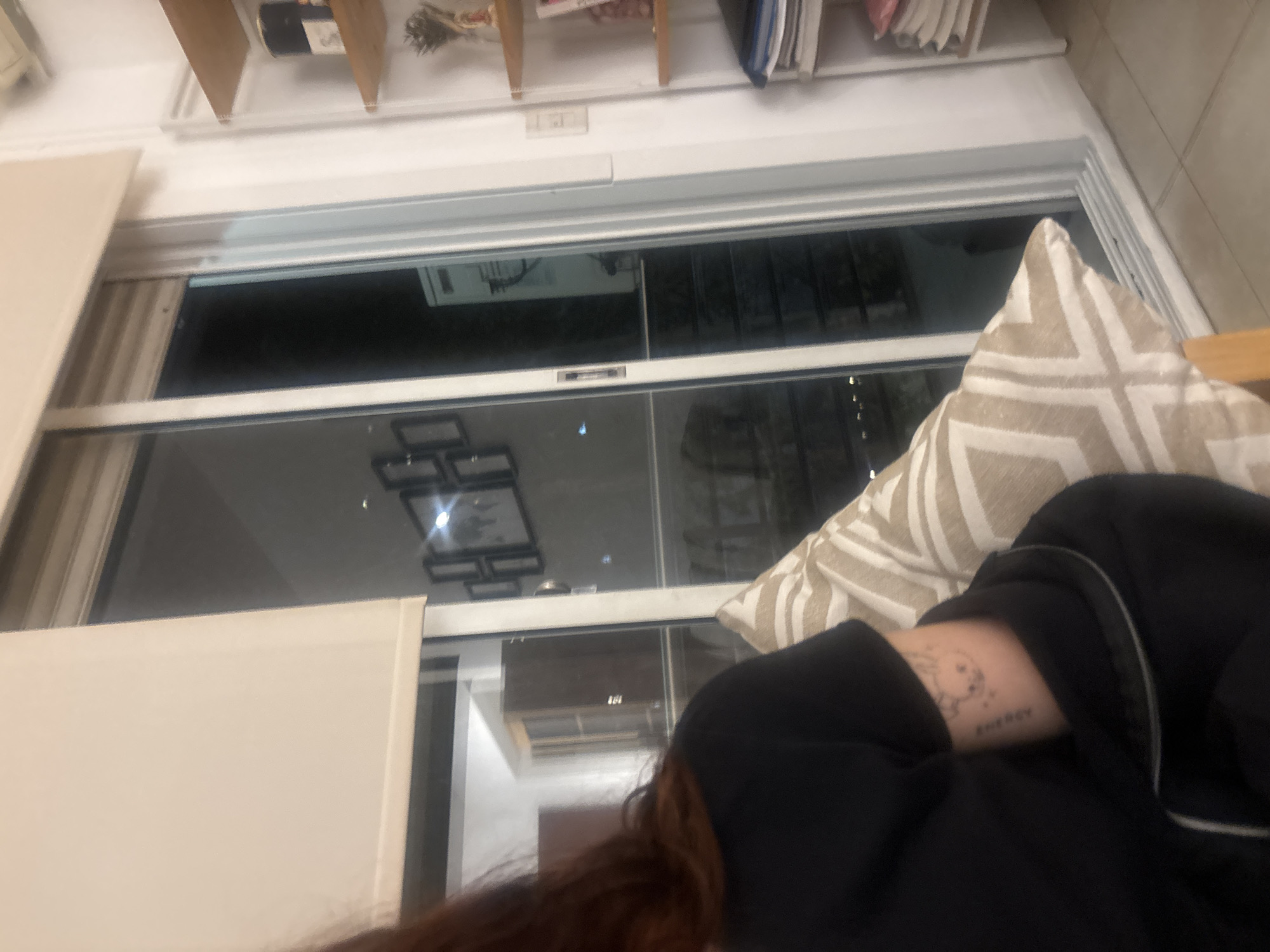 The image depicts an indoor nighttime scene, likely within an apartment in Buenos Aires, Argentina. A person, viewed from the mid-back, with reddish-brown hair, is seated facing away from the camera. They are wearing a black short-sleeved top and a black zippered garment. A tattoo, featuring small figures and the word "ENERGY" vertically, is visible on their right upper arm. The person is resting against a beige and white geometric-patterned pillow. A large glass sliding door or window dominates the background, partially covered by a light-colored roller blind at the top. The glass reflects interior elements, including several dark-framed pictures, a dark piece of furniture, and a white appliance, along with internal light sources. Beyond the glass, a dark, blurred urban landscape with scattered city lights indicates an exterior nighttime environment. To the right of the glass door, a white wall features light wooden shelves. These shelves hold various items, including a dark cylindrical container, a small decorative object resembling dried plants, books, and stacked papers. A white electrical plate (likely a light switch or outlet) is also visible on the wall. The floor in the foreground consists of light-colored tiles.