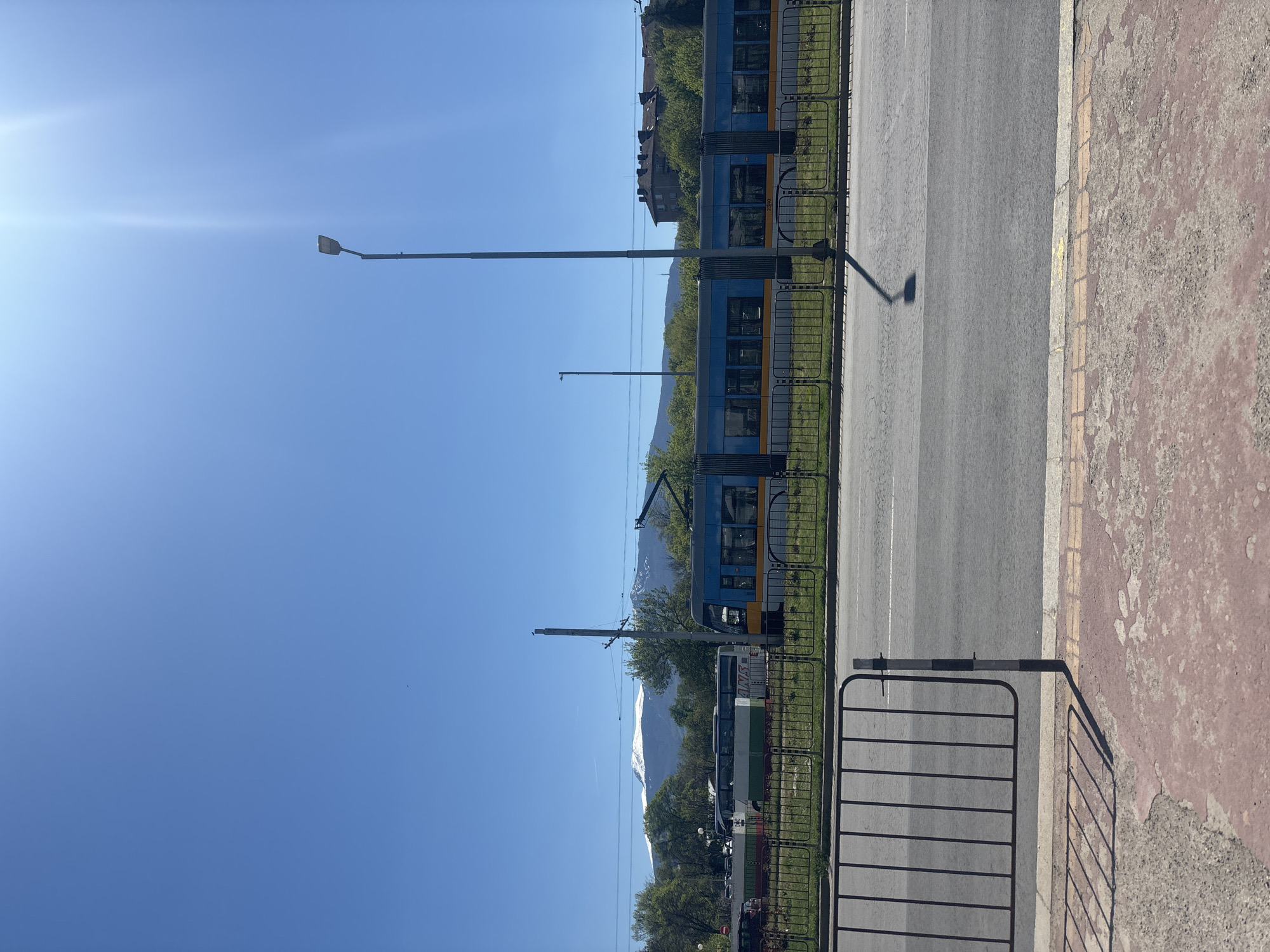 The image depicts a street scene in Sofia, Bulgaria. In the foreground, there's a section of a metal safety barrier and a weathered, pink-toned sidewalk. Adjacent to the sidewalk is a grey asphalt road. A green lawn bordered by a black metal fence is positioned parallel to the road. Beyond the fence, a blue and yellow tram is partially visible. A bus or another large vehicle with white and green markings can be seen further down the road. In the background, there are trees and a building, and a mountain range with snow-capped peaks is visible on the horizon. Overhead, there are tram power lines. The sky is clear blue with a bright spot of light, possibly the sun, in the upper left corner. Streetlights are positioned along the roadside.