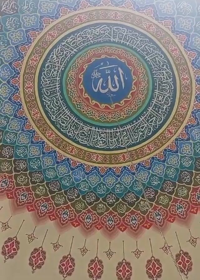 n upward view of an ornate ceiling with Islamic calligraphy and geometric patterns in concentric circles. The innermost circle contains the word "Allah" in Arabic script, centered in a blue disc. Surrounding this are several rings of calligraphic text and decorative patterns in shades of blue, green, red, and gold. The outermost area of the ceiling features a repeating pattern of teardrop-shaped motifs. The video is taken from below, suggesting the viewer is looking up at the decorated ceiling. The lighting is bright, possibly from natural light entering the space. An audio track accompanies the visual.
