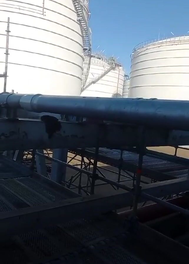 large industrial complex with several large, white cylindrical tanks, interconnected metal pipes, and metal platforms. The video begins with a close-up of the pipes and platforms, then pans to reveal more of the complex, including other structures like scaffolding and a red and white transmission tower in the background. The sky is blue and clear.