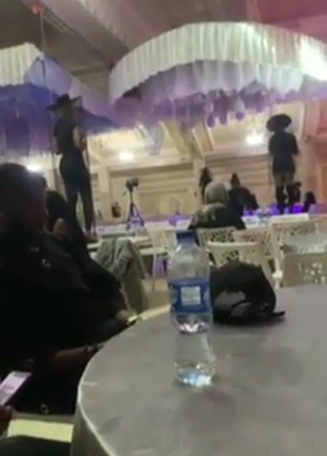 inside of a large hall. The space appears to be set up for an event, possibly a performance or show, as there is a stage with performers and event lighting. People are seated at tables, some seemingly watching the performance. A water bottle and a hat are sitting on the table in the foreground. The ceiling is high and decorated with ornate patterns and chandeliers. The scene is well lit and the camera angle is low, giving the viewer a sense of being seated at one of the tables.
