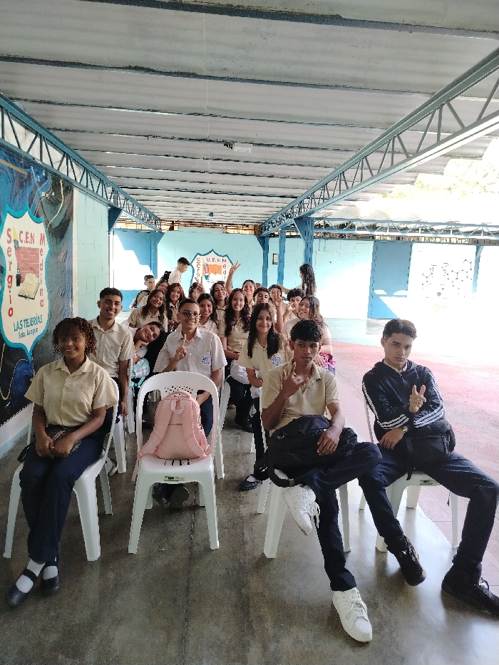 The image depicts approximately 25 young individuals, predominantly teenagers, situated in a covered outdoor area of a school located in Las Tejerías, Venezuela