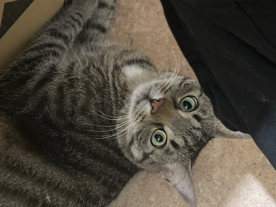 - "A tabby cat lies on its back, looking directly at the viewer" by FM-uZazy2, licensed under CC BY 4.0
