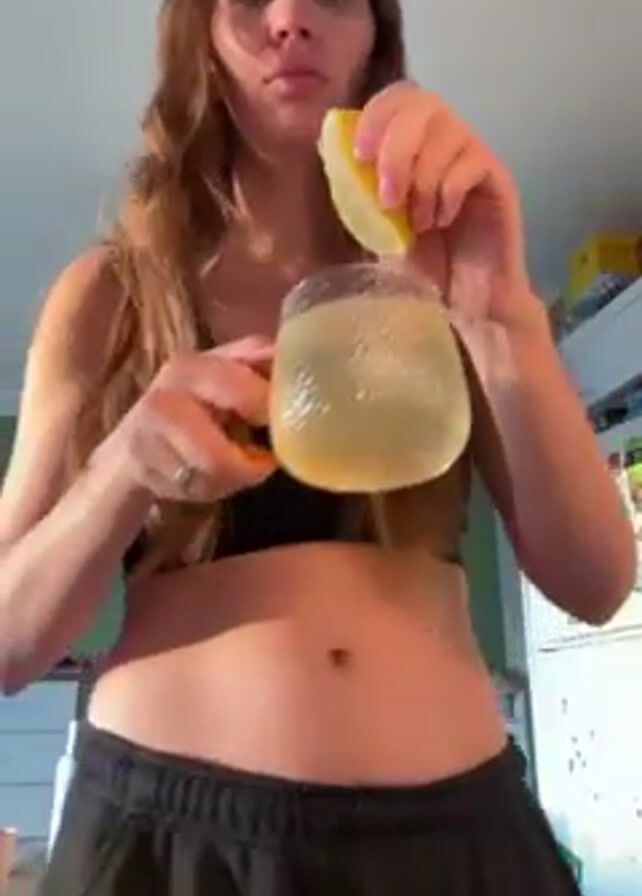 A woman with long brown hair and wearing a black sports bra and black sweatpants stands in what appears to be a kitchen. She is holding a glass mug filled with a yellowish liquid in her left hand. In her right hand, she holds a lemon wedge and proceeds to squeeze the lemon juice into the mug. The background reveals a refrigerator with various items attached, a white water bottle, and a glimpse of other household items, suggesting a casual, homey setting.