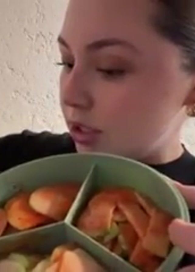 A young woman with dark hair pulled back into a bun is presenting a snack platter. The platter is light green, divided into three sections, each filled with orange and white items. She shows the platter, then holds up a green apple, followed by a bottle of Chamoy. She’s wearing a black long-sleeved shirt and gold earrings. Behind her is a white wall with abstract silver wall hangings and a glass shelf.