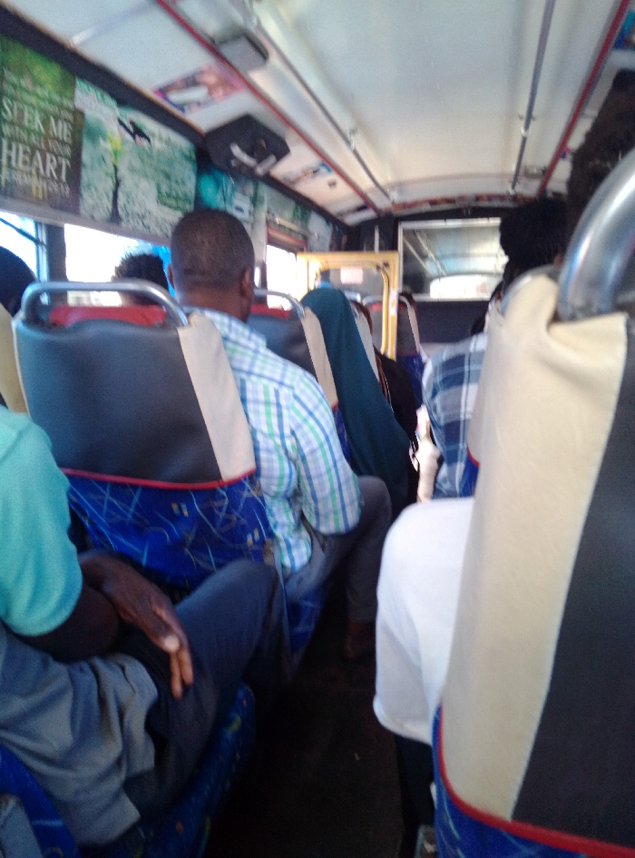 The image displays the interior of a public transit vehicle, specifically a bus or large van, at an unknown location within the city of Unknown, Unknown