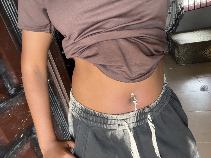 The image captures a partial view of an individual standing indoors in Ipetumodu, Nigeria. The person, exhibiting medium-brown skin, wears a brown short-sleeved t-shirt pulled up to expose the abdomen, and dark grey sweatpants with a white drawstring. A navel piercing is present, featuring a silver-colored butterfly charm with a dangling tear-drop element. Slight erythema is noted immediately surrounding the piercing site. The individual's right arm is visible. The background on the left consists of a dark, possibly wooden, vertical surface marked with white spatter. The background on the right reveals a light-colored tiled floor, a patterned storage box, a partially obscured window with horizontal grates and a patterned curtain, and a small, dark object resting on the floor.
