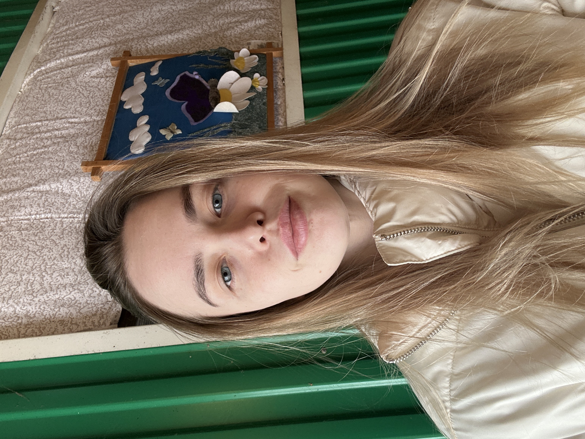 A young adult female is depicted in a head-and-shoulders portrait, positioned centrally and looking directly at the viewer with blue eyes and a subtle smile. Her long, straight, light brown hair falls over her shoulders and chest. She is wearing a light beige or cream-colored padded jacket with a silver zipper detail at the collar. The background on the left consists of a vertical section of a corrugated green metal panel. Behind her right shoulder and head, a light-colored, patterned fabric or wallpaper is visible, over which a wooden-framed art piece is mounted. This artwork features a blue background with white clouds, a large dark purple flower, smaller white and yellow flowers, and small yellow butterfly shapes. The scene takes place indoors in the city of Азинский, Russia.
