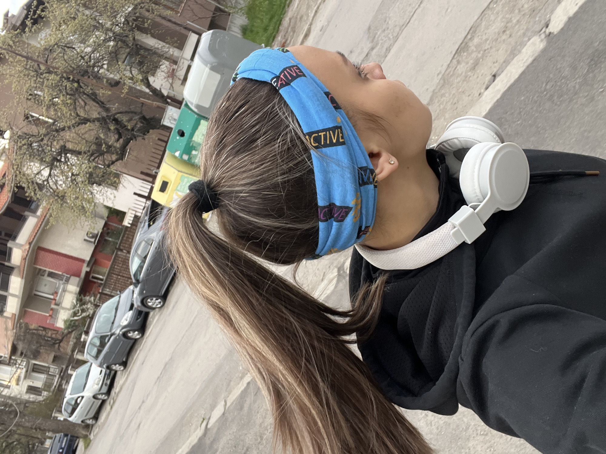 A medium-shot photograph shows a young woman wearing a blue headband with the word "ACTIVE" printed on it. Her brown hair is pulled back into a ponytail. She wears white headphones around her neck and is dressed in a black hoodie. The background includes buildings, trees, and parked cars. The location is Pernik, Bulgaria.