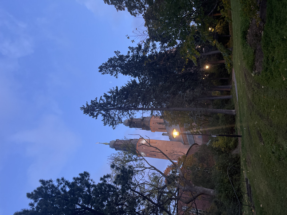 The image displays an exterior view of Katarina Church (Katarina kyrka) located in Södermalm, Stockholm, Sweden, observed during twilight hours. The primary subject is the large brick church structure, featuring two prominent towers. The taller left tower includes an illuminated clock face and a pointed spire, while the right tower is shorter, capped with a rounded dome and smaller decorative spires. In the foreground, a grassy embankment slopes gently upwards, exhibiting darker ground patches, possibly from wear or moisture. A set of concrete or stone steps is partially visible on the far left. The midground consists of a park area densely populated with various trees, including tall, dark coniferous trees and deciduous trees displaying early autumn foliage. A winding paved path is discernible through the trees on the right side of the frame. Multiple period-style streetlights with illuminated yellow globes are strategically placed throughout the park, casting localized light. The sky is a deep blue, indicative of either dusk or dawn, with sparse, thin clouds present. No individuals, animals, or explicit actions are depicted in the scene.