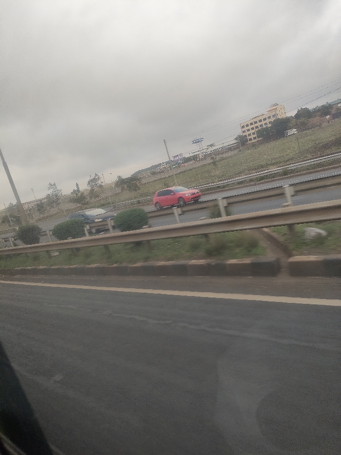 The image displays an overcast daytime scene of a multi-lane highway in the Gatongora ward, Kenya. In the immediate foreground, a dark asphalt road surface with a yellow edge line is visible on the right. A three-bar metal guardrail runs horizontally across the mid-section, separating the foreground from active traffic lanes. Behind the guardrail, two vehicles are in motion, traveling from right to left. A dark-colored hatchback or sedan is partially visible in the left lane, while a red hatchback, identified as a Volkswagen Golf, is fully visible in the right lane. These vehicles are on a paved road surface, with a grassy median containing several spherical green bushes separating the lanes. In the background, an elevated grassy embankment with sparse trees and utility poles is present. A multi-story, light-colored building with visible windows stands prominently on the upper right of this embankment. A white truck or van is discernible on a higher road section or parking area near the building. Further in the distance, indistinct blue signage or a billboard is partially visible above the embankment. The sky is uniformly overcast, indicating dense cloud cover. No pedestrians are visible.